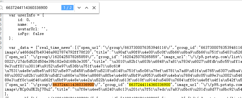 查看列表页第一条链接,链接地址为“https://www.toutiao.com/group/ 6637244114360336900/”,在该网页,鼠标右键,选择查看源代码,“Ctrl+F”查找字符串“6637244114360336900”,定位其位置。