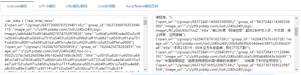 观察可知,中文字符都以”\u”开头的字符串表示,显示为unicode编码格式,由“站长工具”在线转编码之后即可展示中文。