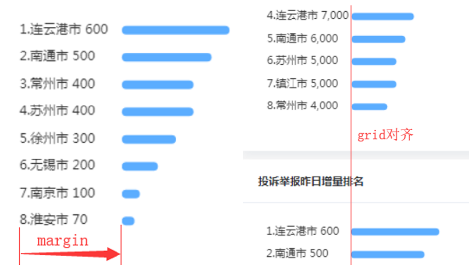 多个grid对齐:containLabel为false,axisLabel的margin一致,grid的left一致。