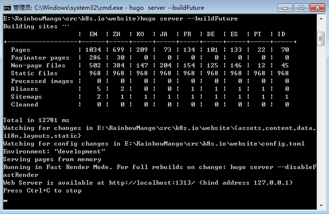 将kubernetes/website clone到本地,然后进入该项目目录中。在该目录中启动命令行(shift+右键,启动命令行),使用命令hugo server --buildFuture即可启动文档服务器。如下图所示:
