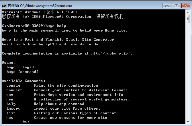 安装完成后,打开命令行窗口,执行hugo help命令可以验证安装是否成功。