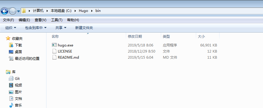 创建目录C:\Hugo\bin,并将上一步骤下载的包解压到该目录即可,完成后效果如下图所示: