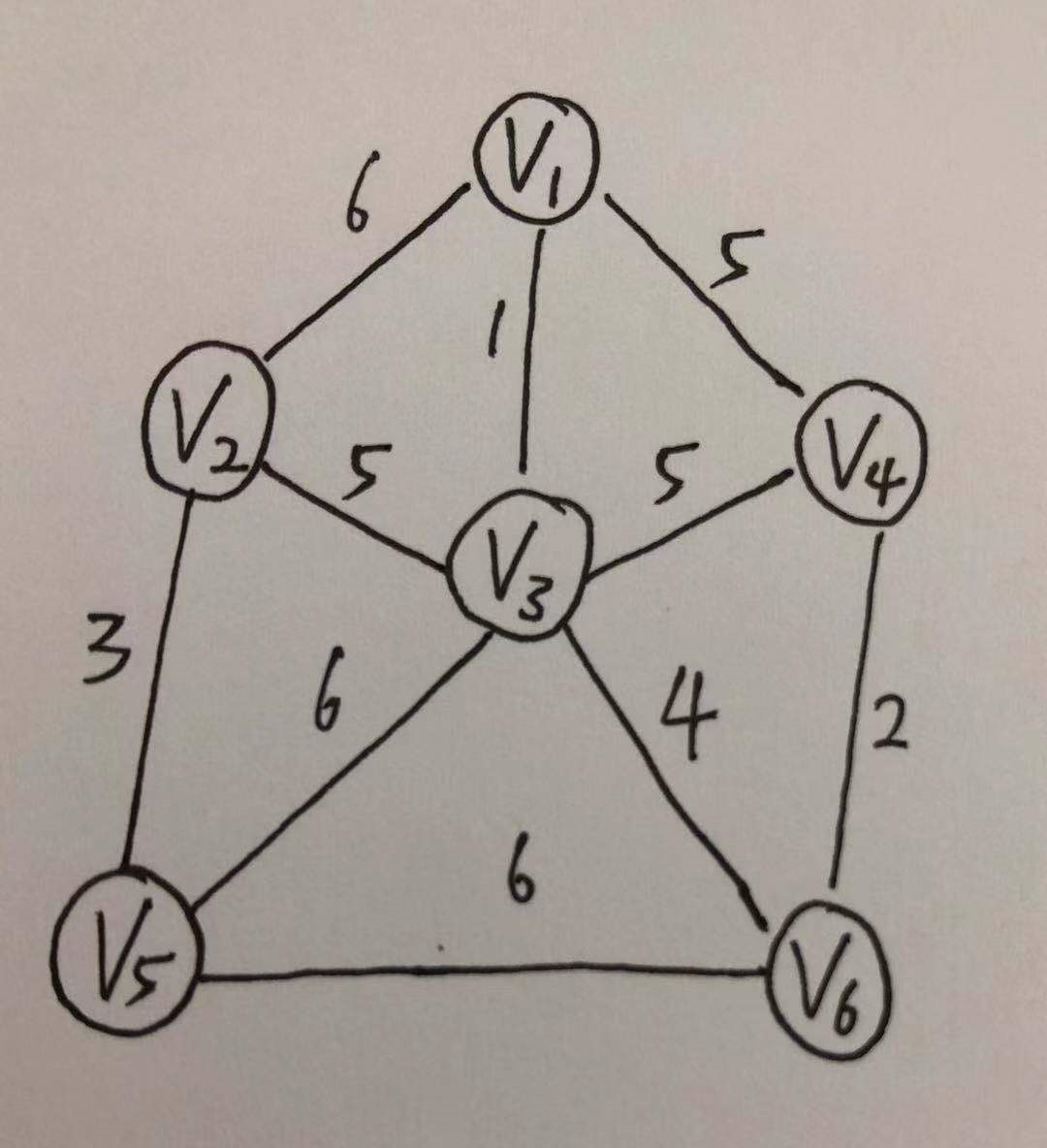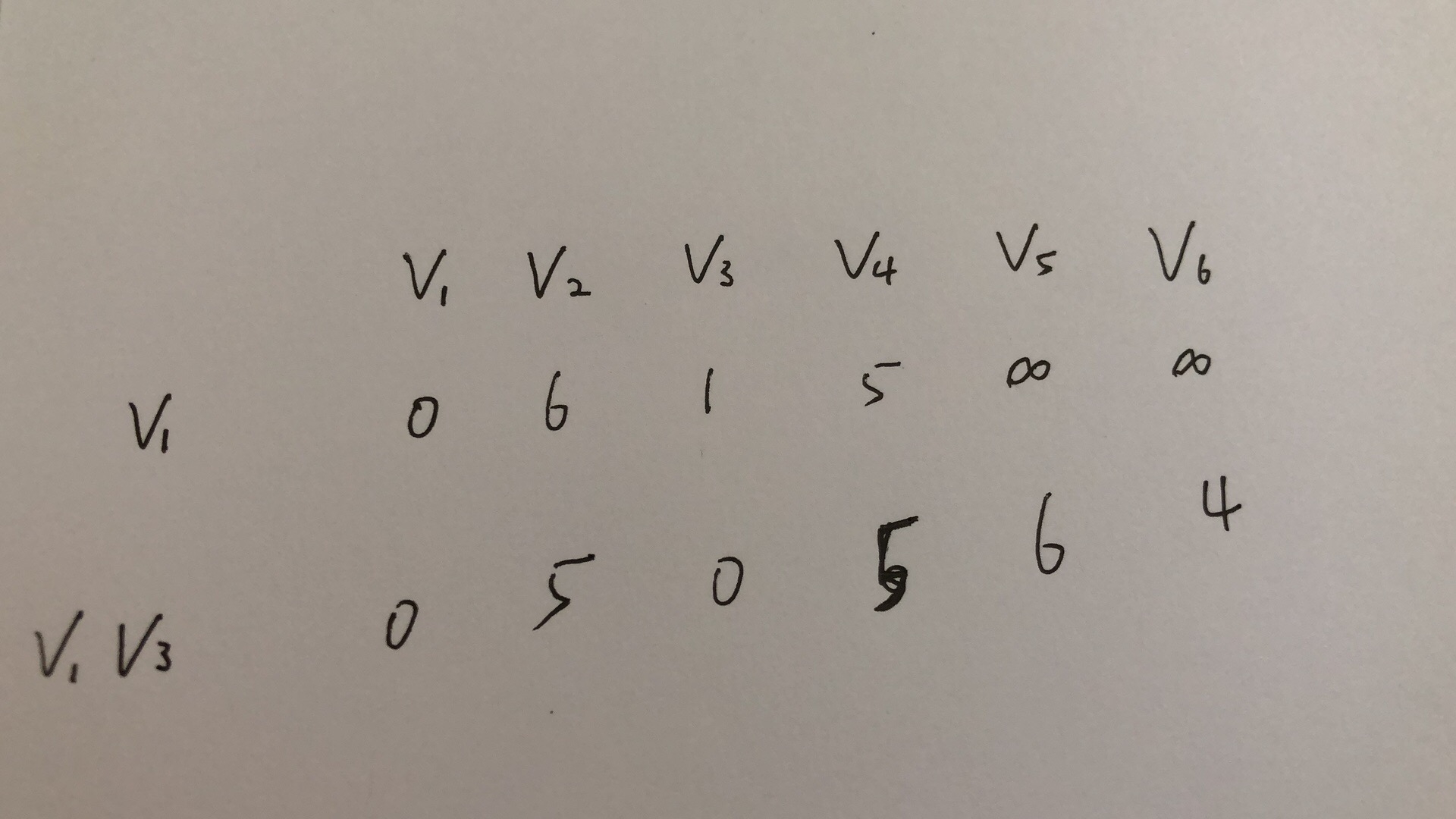 最小生成树中只有V1一个点,最小生成树到各点的距离如图所示。下一步添加最小的边,因为v1已经在最小生成树中,所以添加v3。