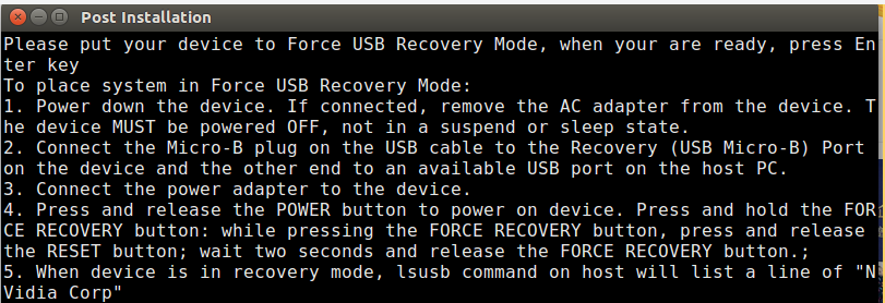 (15)此时,将TX2断电,并将TX2开发板的 microUSB 和主机相连,然后再将TX2上电开机,紧接着按下TX2的RECOVERY按键不松手,接着按下RESET按键并松手2秒后再松开RECOVERY按键。一定要按顺序来。