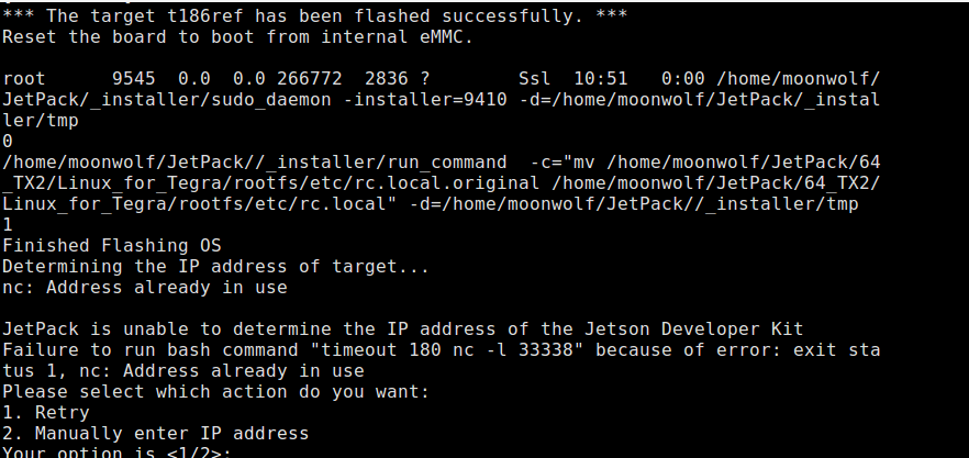 (19)出现上诉坑时, 我们先别选 2 选项,在TX2的系统上,我们进入 home 文件下发现有 “ report_ip_ to_host.sh ”,我们在终端用权限打开该文件,并在文件里面写上主机的 IP 地址。然后在TX2的终端执行如下的命令,主机端执行 Retry 即可解决上诉问题,接着执行剩余的刷机工作。