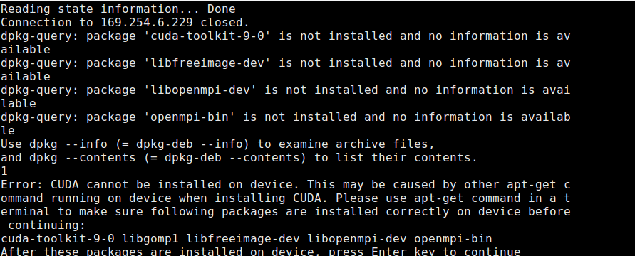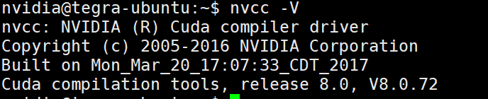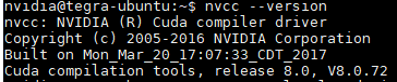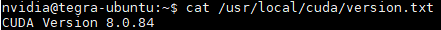 $ sudo dpkg -i cuda-repo-l4t-8-0-local_8.0.84-1_arm64.deb $ sudo apt-get update $ sudo apt-get install cuda-toolkit-8-0