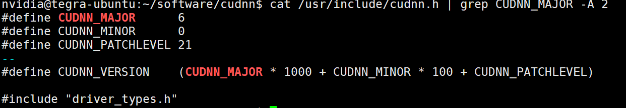 cd /home/nvidia/tx2-software/cudnn sudo dpkg -i libcudnn6_6.0.21-1+cuda8.0_arm64.deb sudo dpkg -i libcudnn6-dev_6.0.21-1+cuda8.0_arm64.deb cat /usr/include/cudnn.h | grep CUDNN_MAJOR -A 2