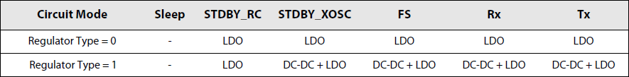 各种模式,电源的使用情况如下图所示,切换由SetRegulatorMode函数完成,该函数必须在STDBY_RC模式下调用。