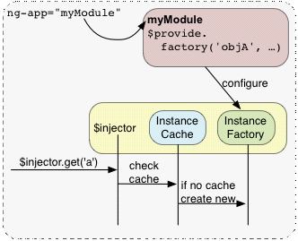 Injector是一个服务定位器。每一个Angular应用,都会有一个单独的injector。Injector提供一个通过名称查找对象实例的途径。Injector会在内部cache中保持所有对象实例,所以重复调用相同的名称时,返回的都是同一个对象实例。如果对象不存在,那么它会请求实例工厂(instance factory)去创建一个新实例。 Module是一个配置injector的实例工厂的方法,被称为”provider”。