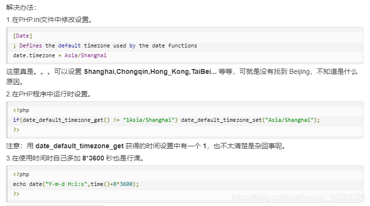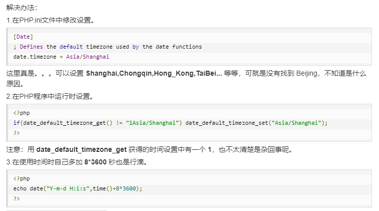 自 PHP5.0 开始,用PHP获取系统时间时,时间比当前时间少 8 个小时。原因是 PHP.ini 中没有设置 timezone 时,PHP 是使用的 UTC 时间,所以在中国时间要少 8 小时