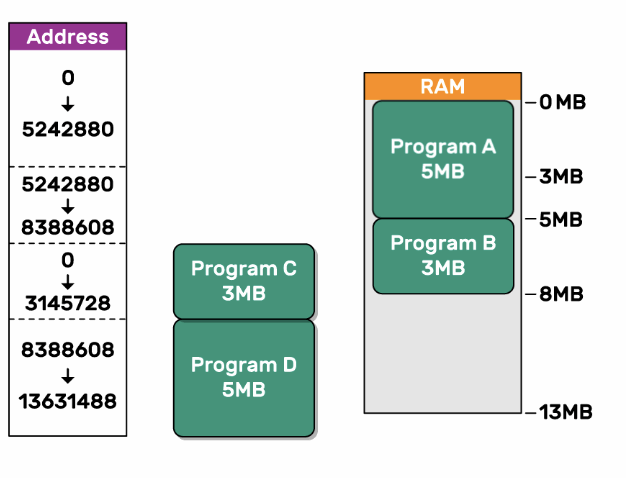 1. Program A loads into address 0 in the RAM, and given 5MB of RAM to run. It’s given a virtual address of 0 to 5242880 Program B loads into address 5242880 and given 3MB of RAM to run. It’s given a virtual address of 0 to 3145728