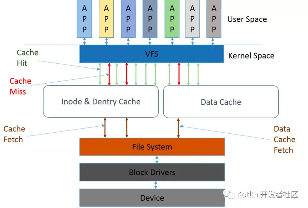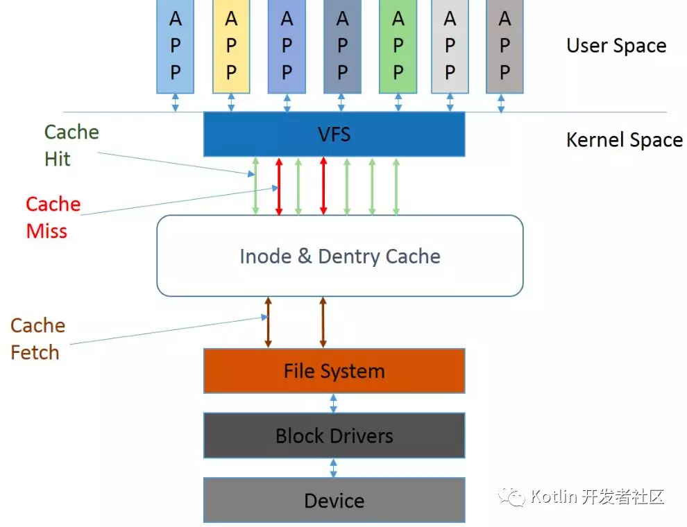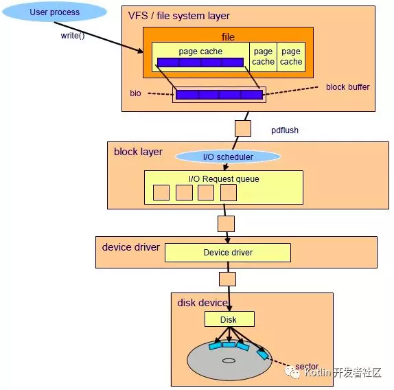在真正的把用户数据读写到磁盘或者是存储设备前,内核还会在page cache中管理这些数据。这些page的存在有效的管理了用户数据和读写的效率。用户数据不是直接来自于应用层,读(read)或者是写入(write)磁盘和存储介质,而是被一层一层的应用所划分,在每一层次中都会有不同的功能对应。最后发生交互时,在最恰当的时机触发磁盘的操作。通过IO驱动写入磁盘和存储介质。