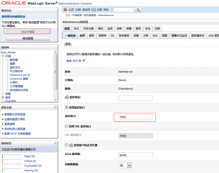对外开放端口时可能需要修改,这时可在本机上访问weblogic,通过控制台直接修改端口。