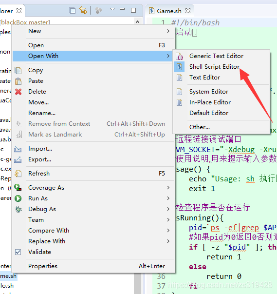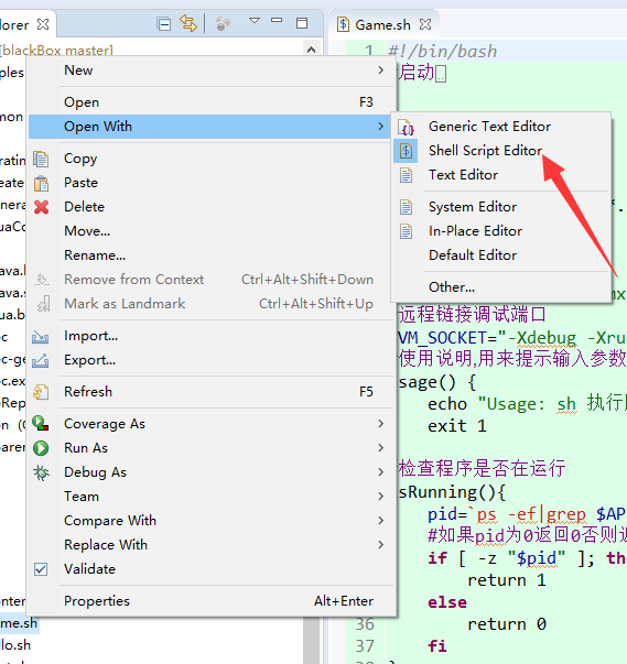 在shell文件上点右键->open with->选择shell script Editor,发现打开的SHELL的文件已经语法高亮:
