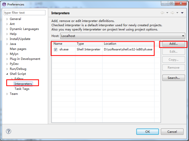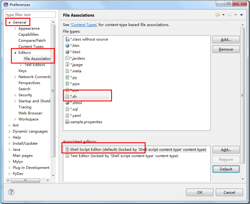 有的eclipse默认是用eclipse自带的text editor打开shell文件的,安装了shelled之后,可以修改使用shelled默认打开*.sh文件,如果没有*.sh这个选项,可以在右边add按钮手工添加一个: