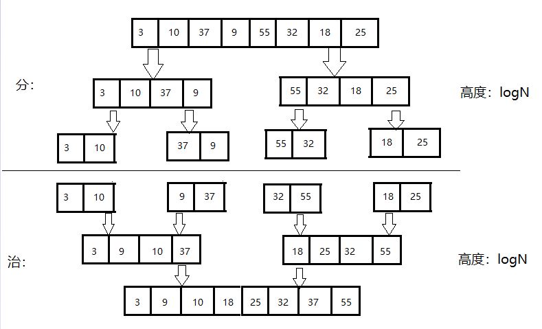 归并排序采用分治思想,现将大问题分解成若干个小问题进行递归求解,再将每个小问题的结果合并起来求解大的问题,分而治之