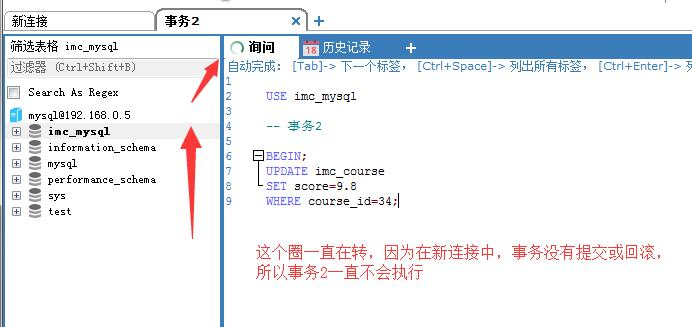 如上图示,在串行化事务隔离级别中,只有第一个事务提交或回滚后,第二个事务才能执行。