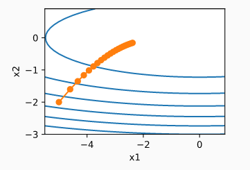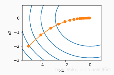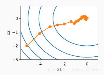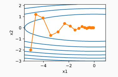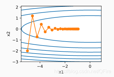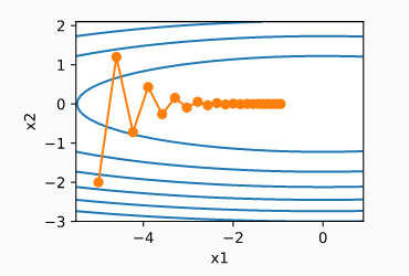 在每次迭代中,梯度下降根据自变量当前位置,沿着当前位置的梯度更新自变量。然而,如果自变量的迭代方向仅仅取决于自变量当前位置,这可能会带来一些问题。如下图,可以看到,同一位置上,目标函数在竖直方向(x2)比在水平方向(x1)的斜率的绝对值更大。因此,给定学习率,梯度下降迭代自变量时会使自变量在竖直方向比在水平方向移动幅度更大。那么,我们需要一个较小的学习率从而避免自变量在竖直方向上越过目标函数最优解。然而,这会造成自变量在水平方向上朝最优解移动变慢。