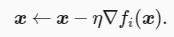 随机梯度下降(stochastic gradient descent, SGD)减少了每次迭代的计算开销。在SGD的每次迭代中, 我们随机均匀采样的一个样本索引,并计算梯度来迭代x: