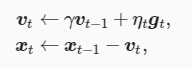 动量法的提出是为了解决梯度下降的上述问题。引入时间步t,使用了指数加权移动平均的思想。它将过去时间步的梯度做了加权平均,且权重按时间步指数衰减。它使得相邻时间步的自变量更新在方向上更加一致。
