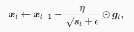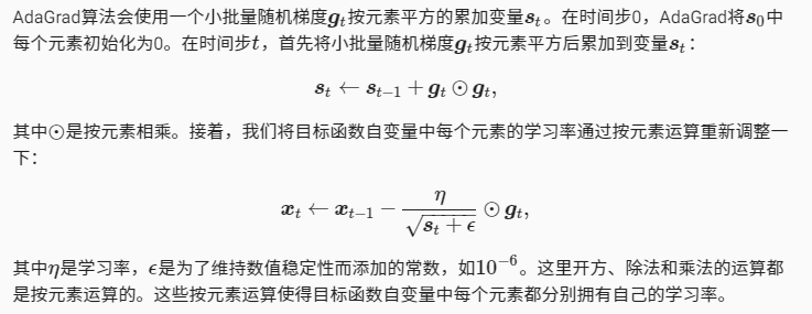 - AdaGrad算法在迭代过程中不断调整学习率,并让目标函数自变量中每个元素都分别拥有自己的学习率。