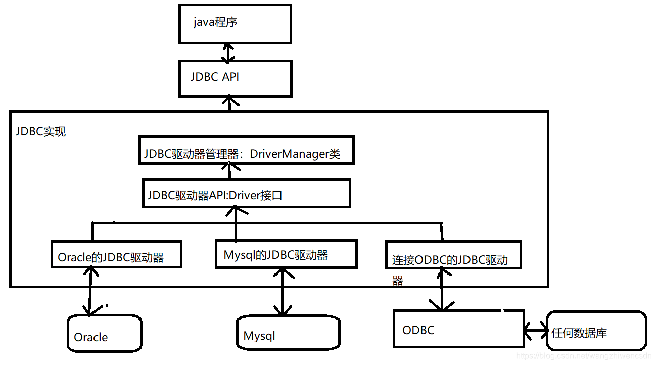 (1)第一类驱动器:JDBC-ODBC驱动器。ODBC(open database connectivity,开放数据库互连)是微软公司为应用程序提供的访问任何一种数据库的标准API。