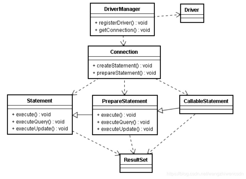 (1)Driver接口和DriverManager类:前者表示驱动器,后者表示驱动器管理类