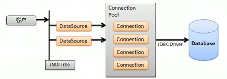 如果直接用程序实现以上功能,则会比较麻烦,所以在Tomcat 4.1.27之后,在服务器上就直接增加了数据源的配置选项,直接在服务器上配置好数据源连接池即可。在J2EE服务器上保存着一个数据库的多个连接。每一个连接通过DataSource可以找到。DataSource被绑定在了JNDI树上(为每一个DataSource提供一个名字)客户端通过名称找到在JNDI树上绑定的DataSource,再由DataSource找到一个连接。如下图所示: