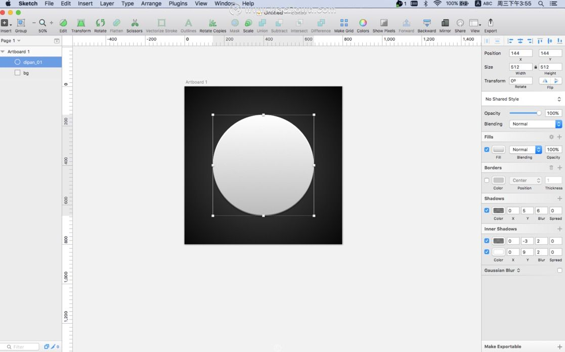 3、我们画出最底层的圆盘512x512,注意这个圆盘我们是用渐变填充的,并调出阴影、高光和厚度: