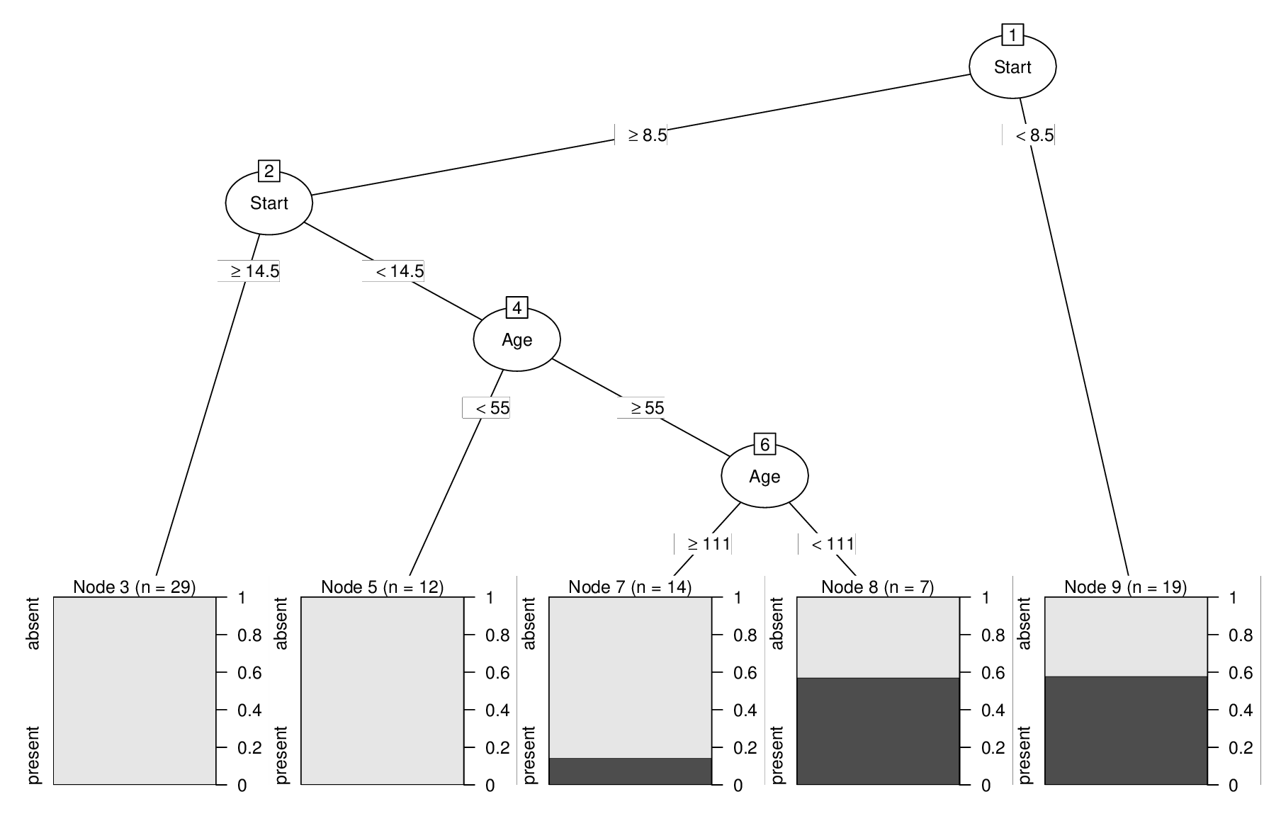3) Start< 8.5 19 8 present (0.42105263 0.57894737) *