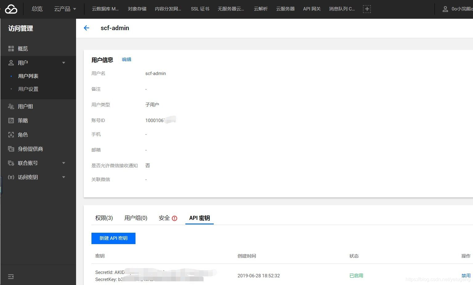基于安全考虑,这里需要使用“子账户”。打开腾讯云控制台 - 访问管理 - 用户 - 新建用户,随便起个名字,例如scf-admin,勾选“编程访问”后点击下一步。从策略列表中选取策略关联,搜索“scf”相关策略,根据需要勾选。用户创建完成后,回到用户列表,点击该用户选择“API密钥”,即可看到SecretId和SecretKey。