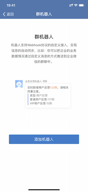 今天(2019-6-28)在更新企业微信时,发现增加了个群机器人的功能,赶紧查了一下文档发现挺符合需求的。群机器人的优点是,通知基于群组,有问题时直接可以在群内沟通,也不会存在重新拉群还需要介绍背景,人员发生变动时拉新人进群即可。