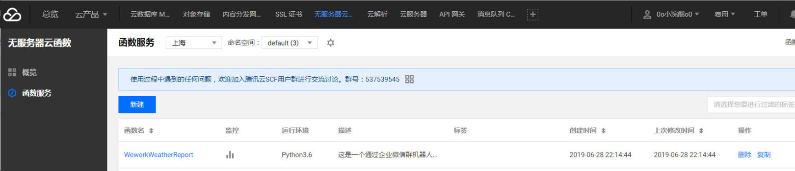 如无异常,此时在腾讯云的控制台中已经可以看到刚创建的WeworkWeatherReport“函数”: