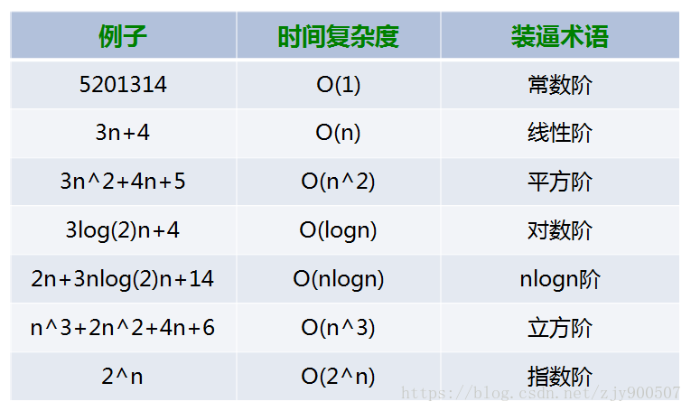 包括 O(1)(常数阶)、O(logn)(对数阶)、O(n)(线性阶)、O(nlogn)(线性对数阶)、O(n<sup>2</sup>) (平方阶)、O(n<sup>3</sup>)(立方阶)。