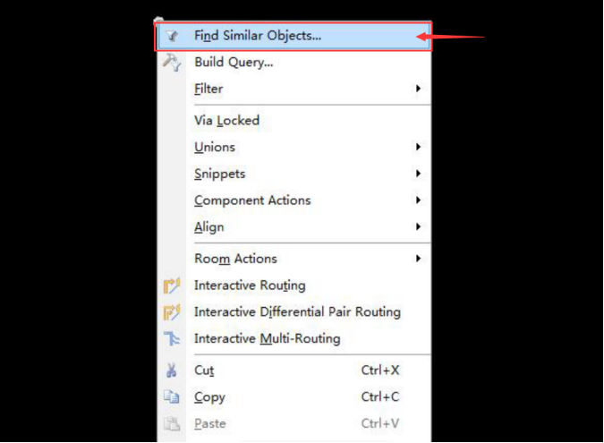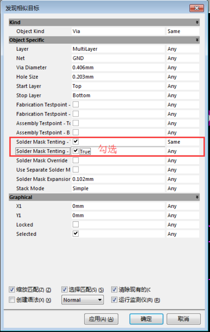 2. 左键单击选择这一过孔(via),然后右键点击(查找相似对像)然后会出现对话框Find Simillar Objects(发现相似目标)。注意勾选红色框选项,然后OK。
