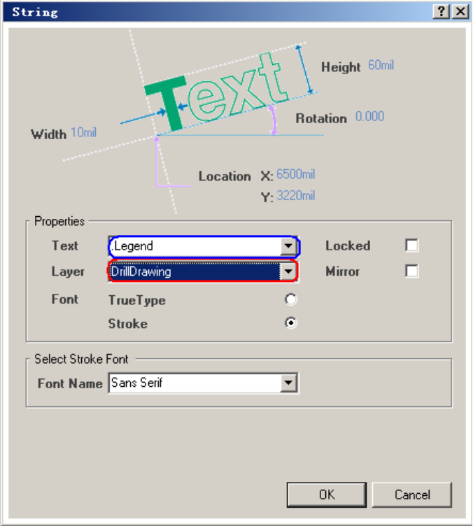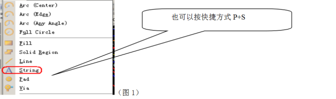 b、放置分孔图列表字符串,请点击主菜单中的Place--String ,然后在文本项选中选择