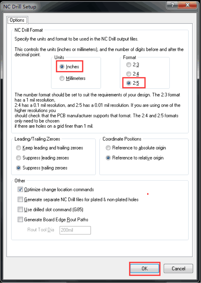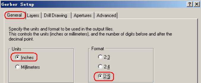 Units:为inch Format:为2 :5 (注意Gerber Files和NC Drill Files要一致)这样有效的减少CAM工程导文件工作量,以免错误。