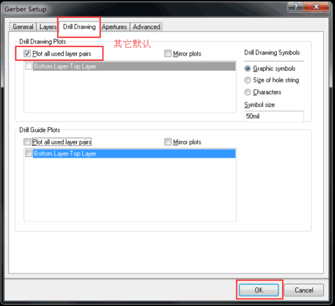 f、设置分孔图层参数,点击Drill drawing菜单,在弹出的下拉菜单中设置如下参数 将Drill Drawing Plots栏Plot all used layer paris打勾,其它默认点OK