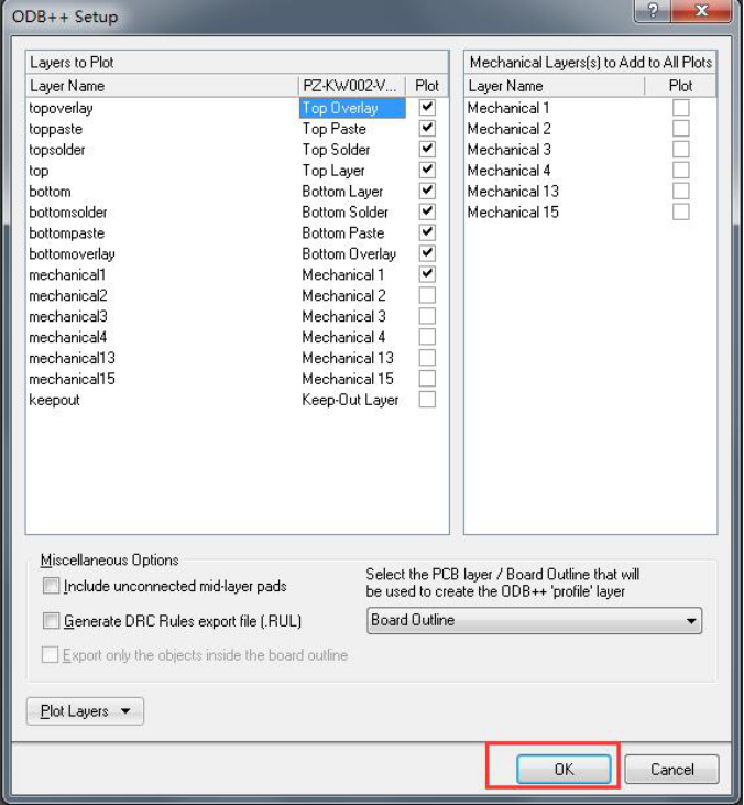 ODB++输出参数同Gerber Files一致,唯一不同的是ODB++输出已经包括了NC Drill Files,也就是说你不用单一去输出钻孔文件。