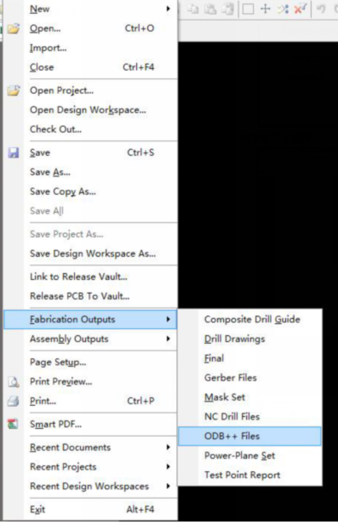 点击File--Fabrication outputs--ODB++ Files如下图:
