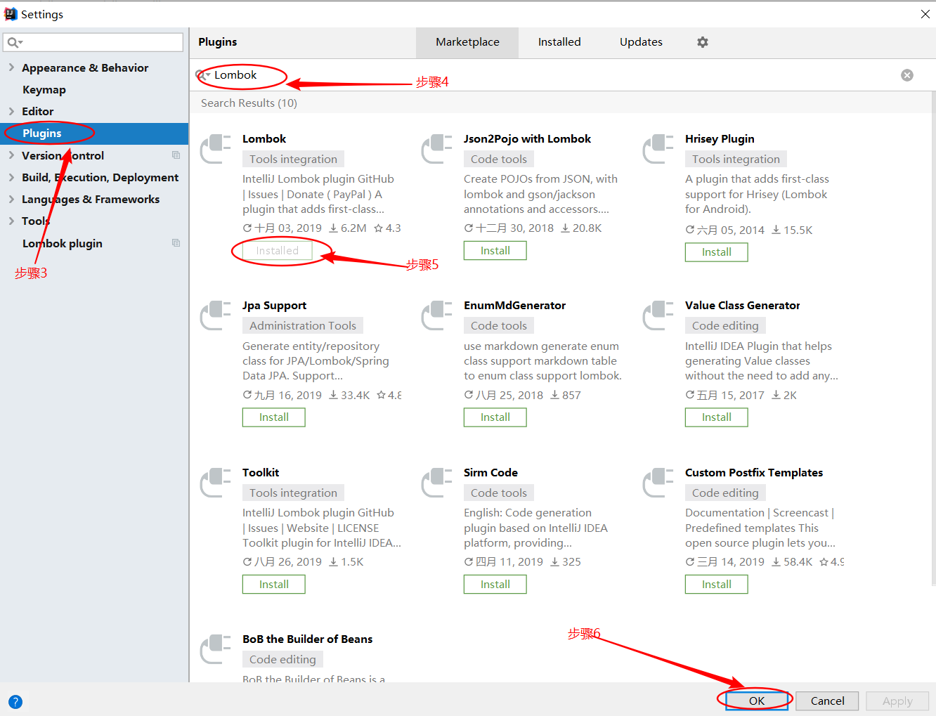 File--->Settings...---->Plugins--->搜索Lombok----->点击Install安装---->安装完毕点击ok即可