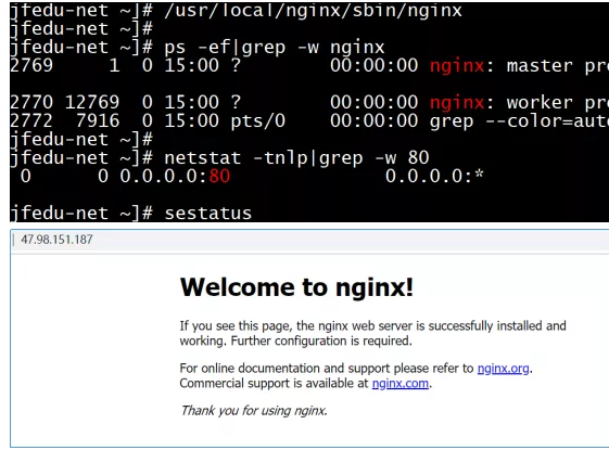 | #!/bin/bash #2019年9月5日15:10:57 #auto install nginx web. #by author www.jfedu.net ##################### yum install -y wget tar make gzip gcc yum install -y pcre pcre-devel zlib-devel wget -c http://nginx.org/download/nginx-1.16.0.tar.gz tar -xzf nginx-1.16.0.tar.gz cd nginx-1.16.0 useradd -s /sbin/nologin www -M ./configure --prefix=/usr/local/nginx/ --user=www --group=www --with-http_stub_status_module make make install /usr/local/nginx/sbin/nginx ps -ef|grep -w nginx netstat -tnlp|grep -w 80 setenforce 0 firewall-cmd --add-port=80/tcp --permanent systemctl reload firewalld.service iptables -A INPUT -m tcp -p tcp --dport 80 -j ACCEPT service iptables restart |