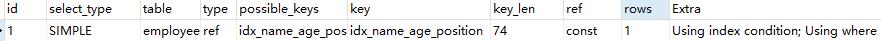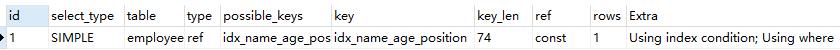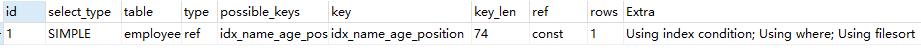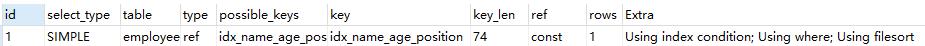 从explain的执行结果来看:key_len=74, 查询使用name索引,由于用了position进行排序,跳过了age,出现了Using filesort。