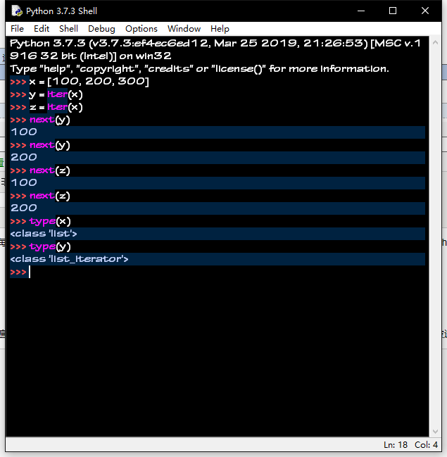 >>> x = [100, 200, 300] >>> y = iter(x) >>> z = iter(x) >>> next(y) >>> next(y) >>> next(z) >>> next(z) >>> type(x) >>> type(y)