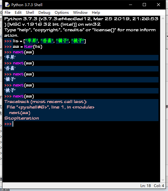 >>> lis = ["苹果", "香蕉", "橘子", "桃子"] >>> aa = iter(lis) >>> next(aa) >>> next(aa) >>> next(aa) >>> next(aa) >>> next(aa) #超出遍历的范围时会报错