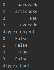 string_data = pd.Series(['aardvark', 'artichoke', np.nan, 'avocado'])