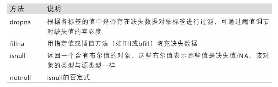 NA数据可以是不存在的数据或者是存在但不可观察的数据。Python内建的None值在对象数组中也被当做NA处理。
