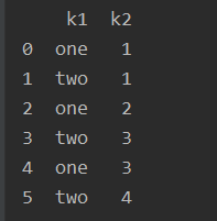 data = pd.DataFrame({'k1': ['one', 'two'] * 3 + ['two'], 'k2': [1, 1, 2, 3, 3, 4, 4]})