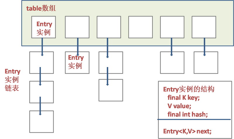 可以看出,HashMap底层就是一个数组结构,数组中的每一项又是一个链表。当新建一个HashMap的时候,就会初始化一个数组。table数组的元素是Entry类型的。每个 Entry元素其实就是一个key-value对,并且它持有一个指向下一个 Entry元素的引用,这就说明table数组的每个Entry元素同时也作为某个Entry链表的首节点,指向了该链表的下一个Entry元素,这就是所谓的“链表散列”数据结构,即数组和链表的结合体。