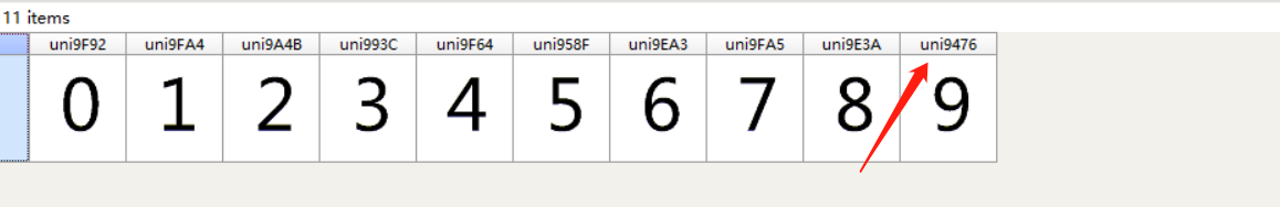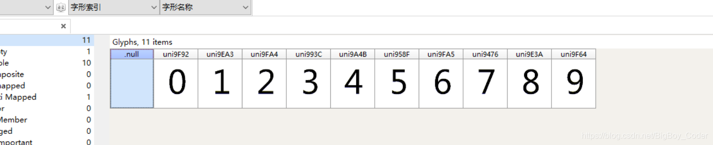 从这张图我们可以发现,glyph00001对应的是数字0,glyph00002对应的是数字1,以此类推......glyph00010对应的是数字9,